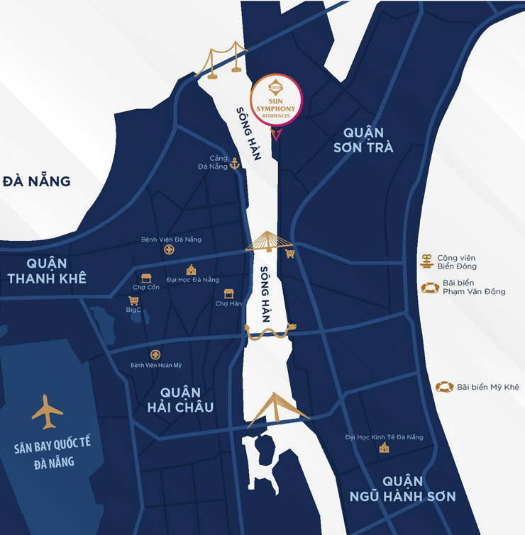 Nằm tại vị trí đắc địa bên dòng sông Hàn thơ mộng và hòa mình vào sự nhộn nhịp của đại lộ Trần Hưng Đạo, Sun Symphony Residences tỏa sáng như một biểu tượng của sự sang trọng và tinh tế ngay giữa lòng thành phố Đà Nẵng sôi động.
